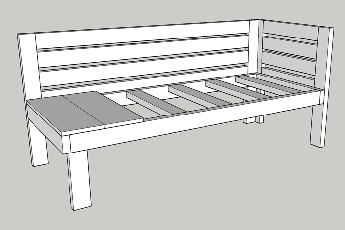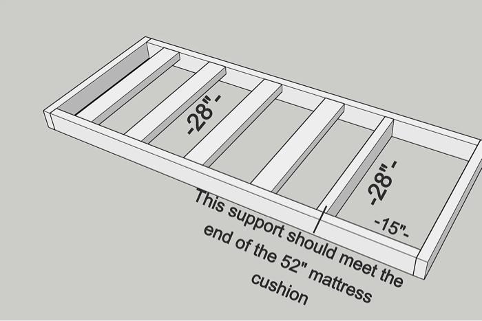 The last 28″ support is flipped vertically and attached at 52″ to butt up against where the mattress cushion will end. This piece also acts as a support for the side table.