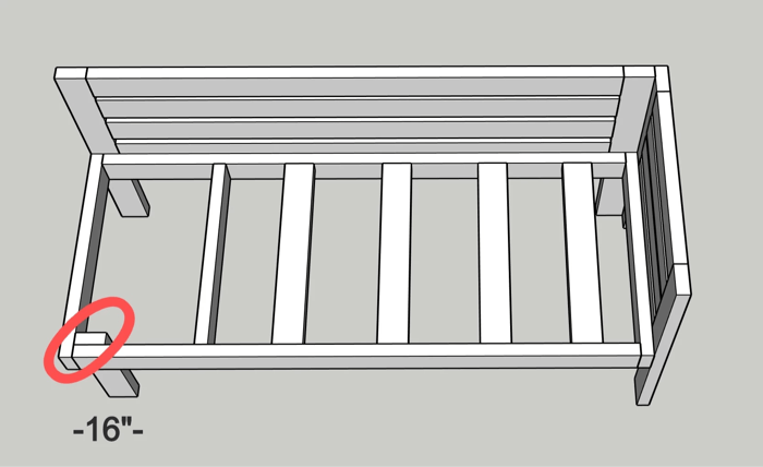 Four of the 28″ supports will be evenly placed from front to back to support the mattress. I set these in the frame one inch down the top so the cushion was set into the frame as opposed to on top of to prevent the cushion sliding. I attached these using pocket hole screws.