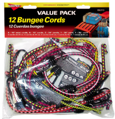 Keep your items securely bundled and organized with the Keeper 12-Pc. Bungee Cord Assortment. It includes one each of 30" & 36", two 24", four each of 10" minis & 18" bungee cords. These dependable bungee cords are made from first quality, long-lasting rubber with a durable UV-resistant outer jacket woven in highly visible, attractive colors. The vinyl-coated, heavy-gauge steel hooks feature a protective coating that won't mar paint and prevents rust.