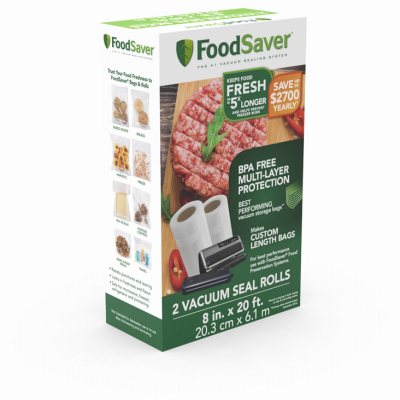 Package and protect your food with custom-cut rolls from FoodSaver. FoodSaver vacuum sealer rolls keep food fresh up to 5x longer,* so you can extend the life of your groceries, eliminate waste, and save money. This 8-inch roll gives you the flexibility of vacuum sealing individual or multiple portions of meat, seafood, fruit, and more with less roll waste. Simply cut to your desired length, seal one end, fill, then vacuum seal. Ideal for use with FoodSaver vacuum sealers, the sealing strip heats to a precise temperature that works specifically with this material, ensuring a secure, airtight seal. Multilayer material resists punctures and tearing to prevent spoilage and freezer burn and can also be used in the freezer, refrigerator, microwave, and for simmering and sous vide cooking up to 195°F/90°C. Experience your foods at the peak of freshness with high-quality FoodSaver rolls. *compared to ordinary storage methods