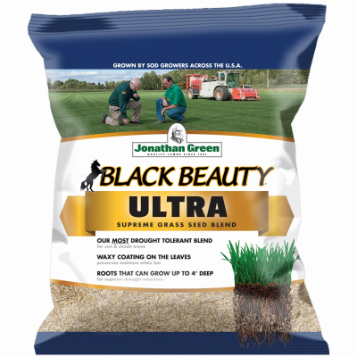 Jonathan Green Black Beauty Ultra Grass Seed, 1 lb. covers 400 sq.ft. It is a blend of 3 varieties of tall fescue, 10% sod quality blue-tastic Kentucky bluegrass for quick fill-ins, and 10% frontier perennial ryegrass for the fastest germination. Suitable for both sunny and shady areas, this elite mix grown by leading sod growers across the United States germinates in 10 to 14 days.