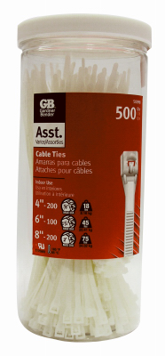 500 Piece Cable Tie Canister, Includes 200 4" Natural Cable Ties, 200 8" Natural Cable Ties, 100 6" Natural Cable Ties.