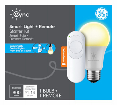 GE Cync, CWLRMDMBWM1/ST-CLEDA199LD1-1. This is a combination package containing a wire-free dimmer smart remote switch and a 9.5 W A19 LED bulb. The bulb has a medium base, is dimmable with a 2700 Kelvin color temperature and a CRI 90. It's rated at 800 Lumens and has a 15,000 hour rated life. CA Title 20 Compliant. Cync app only available in the US & Canada
