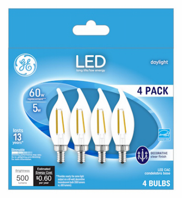 GE 4 Pack, LED5DCAC-AGCDL-4, 5W, Daylight Light Color, Clear Bulb Color, CAC Shape, Decorative LED Light Bulb , Equivalent To A 60W Incandescent, Candelabra Base, Bent Tip, Dimmable, 500 Lumens, 5000 Kelvin Color Temperature, CRI = 80, 13 Year, 15,000 Hours Rated Life, MOL = 4.0", Energy Star Approved, Boxed.