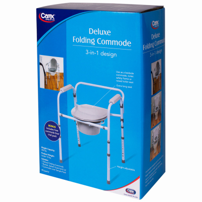 The Deluxe Folding Commode is perfect for those who are short on space. It can be used in three ways: as a stand-alone toilet commode, a raised toilet seat, or a toilet safety frame. This full-size steel commode folds compactly for storage or easy travel and comes complete with a commode bucket, splash guard, and cover. It also includes a trial pack of our Commode Liners.