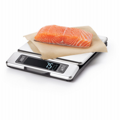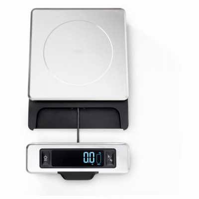 The OXO Good Grips 11-Pound Food Scale with Pull-Out Display is perfect for portioning meat, produce, spices and more. Weigh items directly on the platform, on a plate or in a bowl. The display pulls away from the base to prevent shadowing from large containers. A weight indicator shows the capacity left on the Scale before the 11-pound maximum is reached. Press the Zero button to offset the weight of a container or to set the weight back to zero before adding additional ingredients. The display features large, easy-to-read numbers in 1/8-ounce (US) and 1-gram (metric) increments. The platform is easy to clean by hand and the Scale's thin profile stores neatly. Includes four AAA batteries. Stainless steel body.