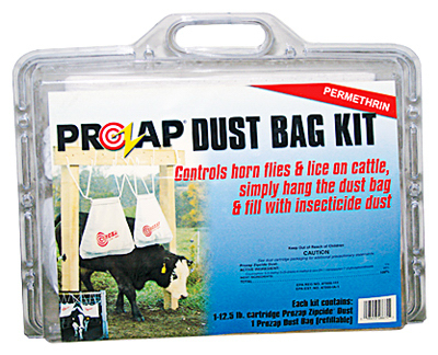 Prozap, dust bag kit, comes with a refillable dust bag & a 12.5 lb ready to use insectrin dust cartridge, for direct application on animals, poultry & bedding, for use on beef cattle, dairy cattle, horses, swine, poultry, dogs & cats, contains .25% permethrin.