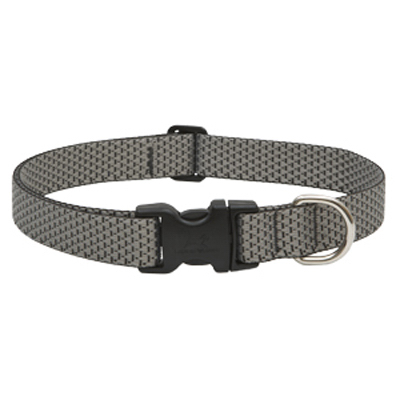 Lupine eco, 1" x 16-28", adjustable dog collar, granite pattern, a unique 2 tone weave, soft yet strong, made from recycled plastic bottles, warm & cool palettes inspired by the natural world, ideal for medium dogs, strong bar tack stitching, welded d-ring, & a custom designed side release buckle, not recommended for tie out, guaranteed even if chewed.