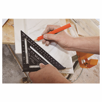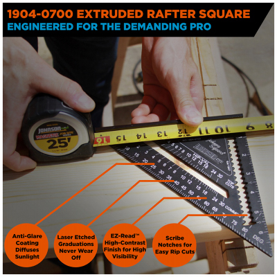 To develop one of the world's best rafter squares, Johnson first had to engineer the EZ-Read™ finish, its revolutionary anti-glare protective coating that diffracts sunlight rather than reflecting it, so it looks as crisp in full sun as it does in the shade. The EZ-Read™ finish also increases friction to better secure your square against your lumber when using it as a saw guide. The Johnny Square® is highly durable and accurate. Its solid aluminum body construction with CNC machined edges ensure an accurate reading every time. This rafter square also features continuous scribing notches that are ideal for ripping at 3-1/2" and 5-1/2" as well as handy markers that measure 2x4 board dimensions of 1-1/2", 3" and 3-1/2".