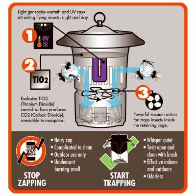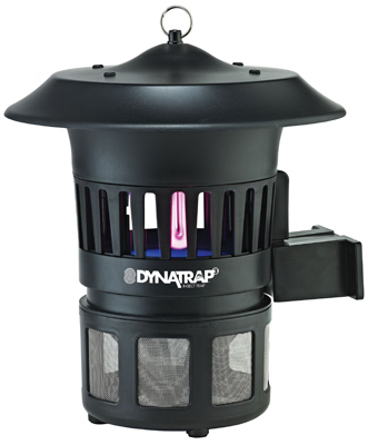 Dynatrap 1/2 Acre Insect Trap. It has more installation options, including a classic hanging chain and wall mount for a fixed lantern-like appearance. It works best when installed 3' or higher above ground. Safe for indoor and outdoor use, this trap employs a 3-way protection system. First, a UV fluorescent bulb generates a warm light, attracting insects. Second, an exclusive Ti02 titanium dioxide coated surface produces CO2 that's irresistible to mosquitoes. Third, a powerful yet whisper-quiet vacuum fan sucks insects into a retaining cage where they will dehydrate and die, usually within 24 hours.