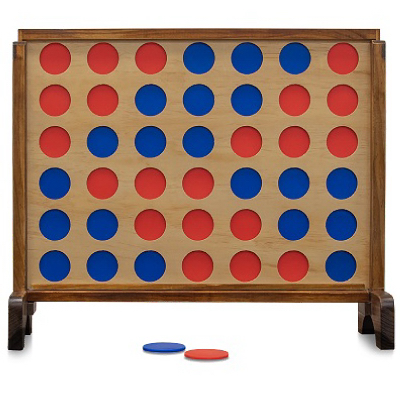 A giant version of the classic 4-in-a-Row game; a beautiful finished wood game measuring 31in/80cm wide. Use the red and blue plastic coins to be the first to connect 4 in a row to win. Pull the wooden bar at the bottom of the game to release the coins when you finish. Quick and easy to assemble.