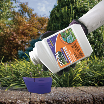 Prevent diseases in your lawn, flowers, trees and shrubs with Infuse Systemic Disease Control Lawn & Landscape from Bonide. This systemic fungicide is effective on 30 listed diseases that commonly appear in lawns and gardens. The active ingredient, propiconazole, stops and prevents diseases including dollar spot, rust, brown patch, powdery mildew, blight, scab, leaf spot and more. Infuse provides broad spectrum and systemic disease control. Use at the first sign of disease for best results. Infuse also works to stimulate growth of newly planted cool season lawns. This concentrated solution arrives conveniently ready-to-mix with water. To use, mix according to label and spray to apply to affected plants. Please see product label for full use instructions. When used as directed, this long lasting disease control solution works for up to 4 weeks.