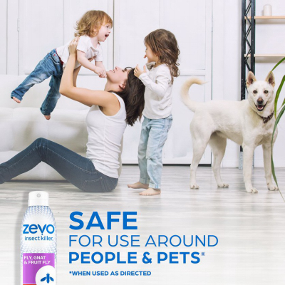 Zevo Instant Action Flying Insect Killer for fruit flies, gnats, and flies uses an improved formula to kill on contact and clean up what bugs leave behind. Powered by cornmint and rosemary essential oils, it is safe for use around people and pets (when used as directed). Zevo Instant Action Flying Insect Killer has no chemical odor or messy residue.