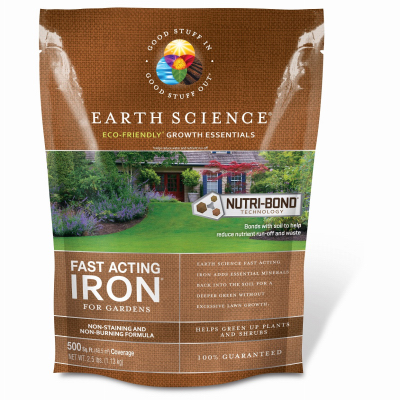 Earth Science 2.5 Lb. 500 Sq. Ft. Coverage Fast Acting Iron Plus Nutri-bond can be used on the lawn or as a Plant & Shrub Fertilizer. Iron contributes to deep green color in plants. Gives grass a green color without excessive growth, no excessive mowing! Contains 9% Iron Oxide. Formula is non-staining and non-burning. Contains Earth Science's patented Nutri-Bond technology that helps the product bond to the soil - giving more effective results and less nutrient run-off. Pelletized for easy application. Lasts All Season.