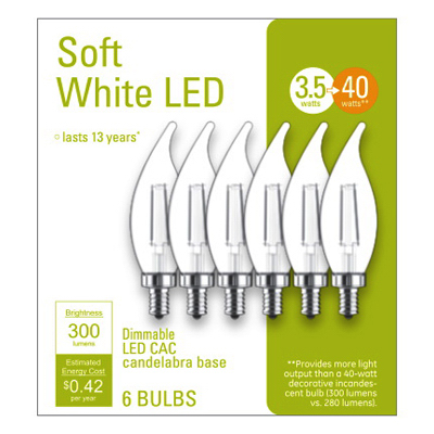 6 Pack, LED4DCAM-AGC-CB6P, 4W, Soft White Light Color, Clear Bulb Color, Candle Bulb Shape, LED Decorative Bulb, Equivalent To A 40W Incandescent, Candelabra Base, All Glass, Dimmable, 300 Lumens, 2700 Kelvin Color Temperature, CRI=80, 13.7 Year, 15,000 Hours Rated Life, MOL=4.43", Boxed.