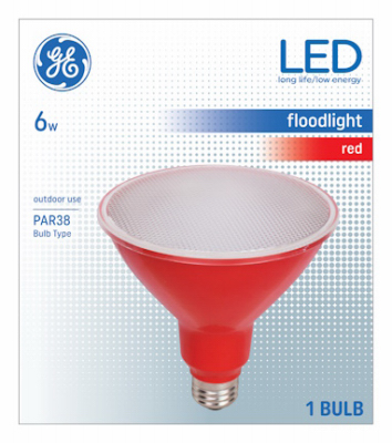 GE LED6P38FLRED/15-1P. 6 watt that is equivalent to a 60 watt incandescent. PAR38 shape, emits red light, with a medium base. Color temperature is 2700K and lumen output is 100. Bulb is non-dimmable has a rated life of 15000 hours. MOL: 5.31". CEC compliant