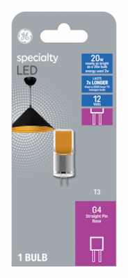 GE LED2T3/G4-OT, 2W, Warm White Light Color, Frosted Bulb Color, T3 Shape, LED Light Bulb, Equivalent To A 20W Incandescent, G4 Base, Non-Dimmable, 190 Lumens, 3,000 Kelvin Color Temperature, CRI = 80, 13.7 Year, 15,000 Hours Rated Life, MOL = 1.25", Desk Lamp, Carded. Can be used in enclosed fixtures.