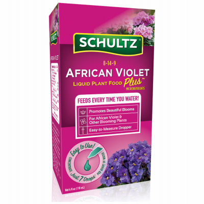 Schultz 4 oz. 8-14-9 African Violet Plus Liquid Plant Food. Specially formulated for African violets and other blooming plants, this easy-to-use liquid food provides the basic micronutrients your flowers need. It is excellent for all varieties of African violets and other plants in the Gesneriad family. Recommended for use with all types of water and potting soil, it feeds every time you water.
