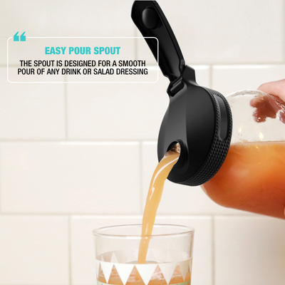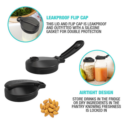 multi tops, flip cap lid, wide-mouth, black single upgrade your mason jars into the most versatile and practical item in your kitchen with multi tops. use them around the house or bring them on the go for a stylish new drinking container. multi tops screw onto the mouth of any wide or regular mouth mason jar and create an airtight seal. each multi top lid features a spout with a leak-proof cap that snaps into place. shake and pour salad dressings, drink your favorite juice, or store granola and other dry foods all with the multi top lid. multi tops are bpa and phthalate-free, so they're safe to store any type of food, and they're dishwasher and freezer safe.