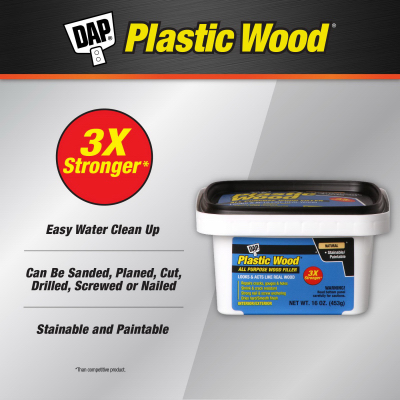 High quality latex-based wood filler formulated to create a surface and body that looks and acts like real wood and provides a repair that is 3X stronger than the wood itself. Stainable and Paintable. It can be used to repair cracks, gouges, holes and other surface defects on furniture, molding, cabinets, plywood, and other wood surfaces. This easy-to-use filler can be troweled and molded for structural repairs and dries fast and hard to a smooth finish that can be sanded, cut, planed, drilled, nailed, or screwed. It provides strong nail and screw anchoring. Cleans up easily with soap and water when wet. For interior / exterior use.