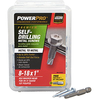 Powerpro, 127 count, 8-18 x 1", hex washer head self drilling metal screws, star drive & pro-stick bit prevent cam-out & increase stability while driving, self-drilling tip means no pre-drilling, quickly penetrates metal up to 1/8" 11 gauge.