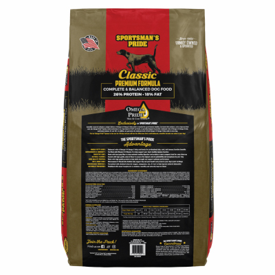 Sportsman's Pride Premium 26/18 Formula Adult Dry Dog Food, 40 lb. Pack. This premium dog food is specially crafted for active working dogs, providing them with the essential nutrients they need to stay in top physical condition. Made with real chicken, it contains 26% crude protein and 18% fat, ensuring endurance and energy. The added chondroitin and glucosamine support joint health, while omega-3 fatty acids promote optimum skin and coat. Controlled levels of ash aid in improved digestion, and naturally preserved ingredients ensure freshness. This balanced and complete diet is enriched with essential vitamins, minerals, and flaxseeds for a healthy immune system and overall well-being.