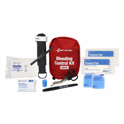 Basic pro bleeding control kit. The lifesaving supplies come in an organized, easy access pouch so you may locate supplies in a hurry. This kit will arm you with the necessary tools to stop life-threatening blood loss before professional help arrives. (1) windlass tourniquet, (1) elastic back-up tourniquet, (1) hema-seal dressing, (2) 5" x 9" trauma pads, (4) nitrile exam gloves, (1) bandage shears to cut clothing, (1) marker to note tourniquet time, (1) emergency rescue blanket and (1) usage guidelines.