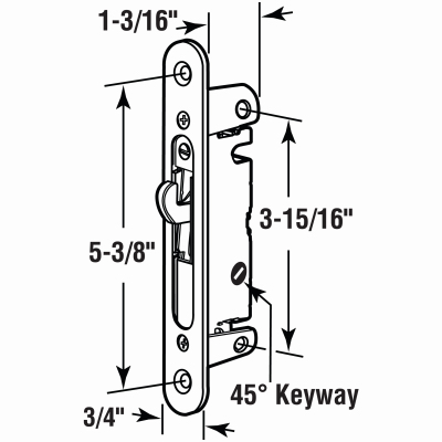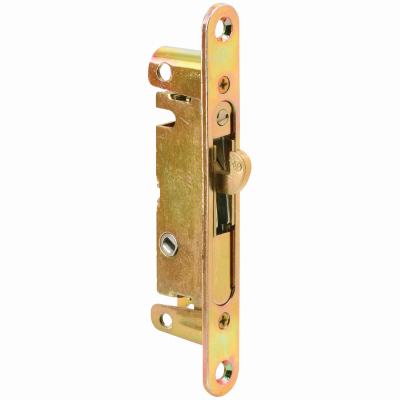 This mortise lock is constructed of steel components with rounded faceplate ends. It features an adjustable, spring-loaded hook latch projection, and it can be used on sliding patio doors constructed of wood, aluminum and vinyl. This lock works with mortise style, surface-mounted patio door handle sets with 45 degree angled keyway positions when in the locked position. The mounting hole centers of this lock measures 5-3/86 inch from center to center, and the rear housing corners are secured with mounting holes that are 3-15/16 inch on center.