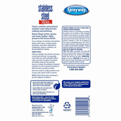 Sprayway 15 oz. Stainless Steel Cleaner & Polish is a water-based, silicone formula that cleans, polishes, and protects all types of stainless steel appliances, including stoves, barbeque grill fronts, tops, and trim. It contains no acid or abrasive substances, so it won't leave a powdery residue. This new and improved formula provides a better shine with less streaking than traditional oil products. Use it regularly to prolong your stainless steel's factory finish. It also works great on stainless steel window frames, trim, kick plates, doors, and chrome surfaces. To use, simply spray it on, use a microfiber cloth, and wipe clean! Follow along the grain of your appliances and use a soft cloth to get a smudge and streak-free look on your dishwasher, fridge, or sink.