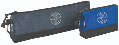 Klein, Stand-up Zipper Bags, 7-Inch and 14-Inch, 2-Pack. Easily access tools and small parts with the Klein Tools Stand-up Zipper Bags. This set includes a 14-Inch dark gray tool bag and a 7-Inch royal blue pouch for organizing tools by specific task. A carabiner is included with each zipper bag to easily attach to tool bags or tool belts (Not for human support). Zipper Bag provides convenient storage for pliers, wrenches, screwdrivers, drill bits and other small tools and parts. Includes two zipper bags: 14-Inch (36.6 cm) dark gray and a 7-Inch (17.8 cm) royal blue bag, both are 4 1/2-Inch tall making them the right size so smaller items will not get lost on bottom. Easily attaches to tool bags or tool belts with the aluminum carabiners (Not for human support). Constructed with heavy-duty, water resistant 1680d ballistic weave material. Reinforced bottom of 2520d Ballistic weave material reduces sharper tools and parts from wearing through.
