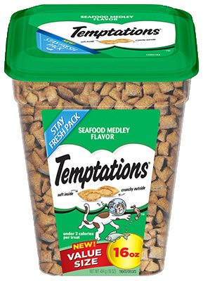 Whiskas temptations, 16 oz, seafood medley cat treat, cat will adore the crunchy outside & soft inside of this seafood medley value pak, which is 100 percent nutritionally complete & balanced for adult maintenance, tartar control, under 2 calories per treat, stay fresh pouch.