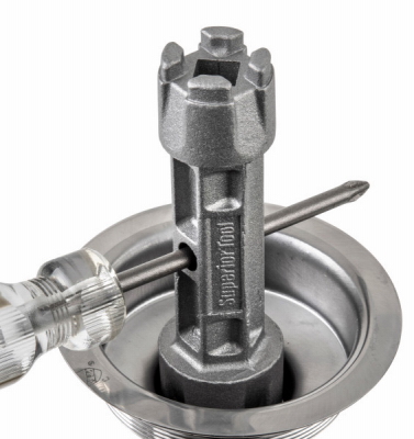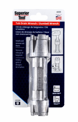 Superior Tool Tub Drain Wrench. It is made of heavy duty die cast aluminum and fits 1-1/2" & 2" closet spuds. It can be turned with an adjustable wrench or heavy duty screwdriver. It installs & removes tub drains & closet spuds. It fits on 1/2" & 3/8" ratchet. Use to easily install or remove Bathtub drains, including those without crossbars, such as Kohler or American standard. Fits 1-1/2 inch closet spuds. Will not scratch fine finishes. Can be turned with an adjustable wrench extension or heavy-duty screwdriver. Will also remove/install toilet seat nuts.
