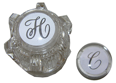 Moen 1 Handle Clear TL Broach Twin Faucet Handle with Hot & Cold Buttons & Screw. It is made of plastic and features Hot and Cold buttons for easy temperature control.