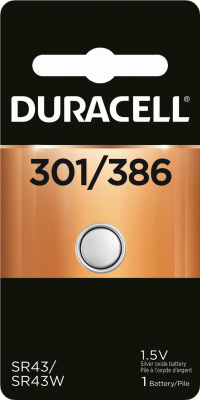 Duracell, 1.5v, #301/386, silver oxide watch battery.