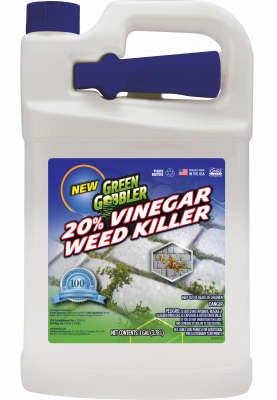 Green Gobbler 1 Gallon 20% Vinegar Weed Killer. Derived naturally from corn, this non-selective herbicide kills annual and perennial weeds and grasses without toxic chemicals. OMRI listed and certified for organic use, it is free of sulfates, VOCs, bleach, dyes, or chloride. It does not contain glyphosate or other harmful chemicals and degrades promptly in the soil. Comes in a F-style gallon bottle with a trigger spray head.