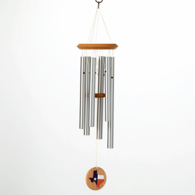 This Texas-branded wind chime embodies the spirit and charm of the Lone Star State, featuring Texas's iconic outline and flag colors. This bright and cheerful-sounding chime is musically tuned to notes from the popular song, "The Yellow Rose of Texas." Written in the 1850s, this song has been recorded countless times and its popularity has made it the "unofficial" song of the state. Crafted from six silver aluminum tubes and a cherry finish ash wood feather, the chime produces soothing melodies, adding a touch of rustic elegance to any outdoor space.
