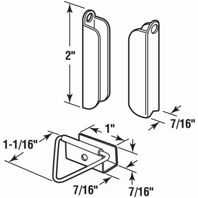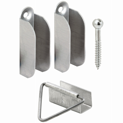 This is a screen hanger and latch set that is used to install screens into a wood double hung window frames. Made of stamped aluminum in a mill finish.